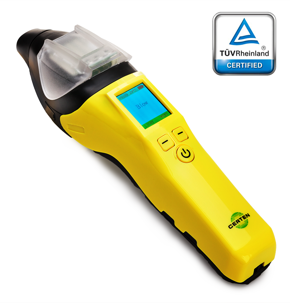 Policyjny alkomat przesiewowy, polecany firmom i instytucjom, które wymagają od pracowników zachowania trzeźwości. Najwyższą jakość w zakresie bezpieczeństwa i kontroli produkcji gwarantuje TÜV Rheinland.